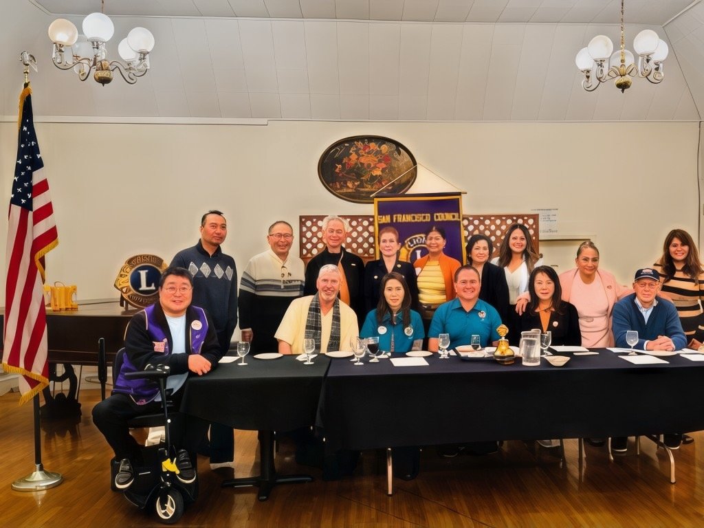 11-19-25 - Photo by Gregory Leung - SFCCLC meting hosted by the Geneva-Excelsior Lions, Italian American Social Club, San Francisco - Most of the visiting Lions striking a pose. Lion President Stephen Martin in the yellow shirt with scarf.
